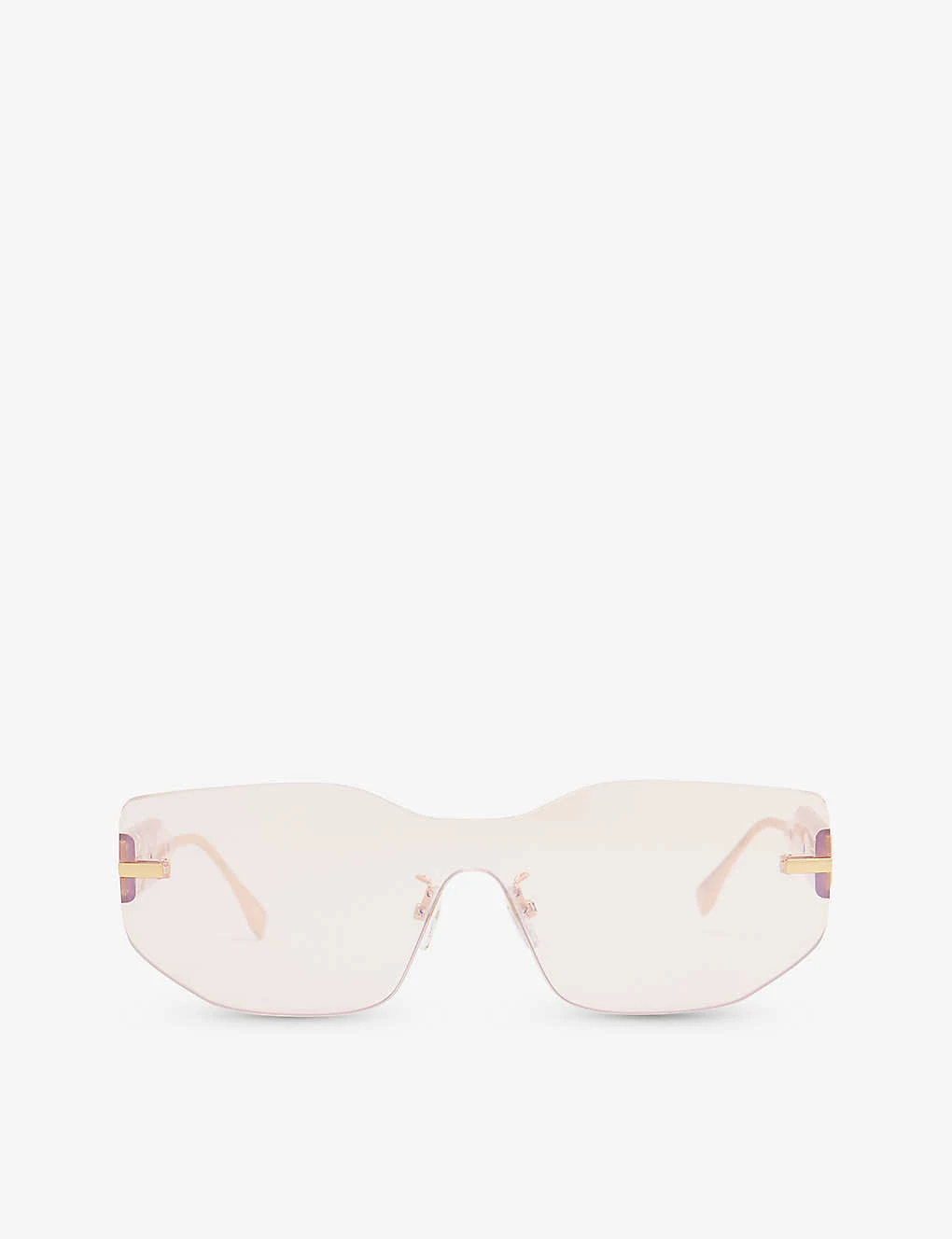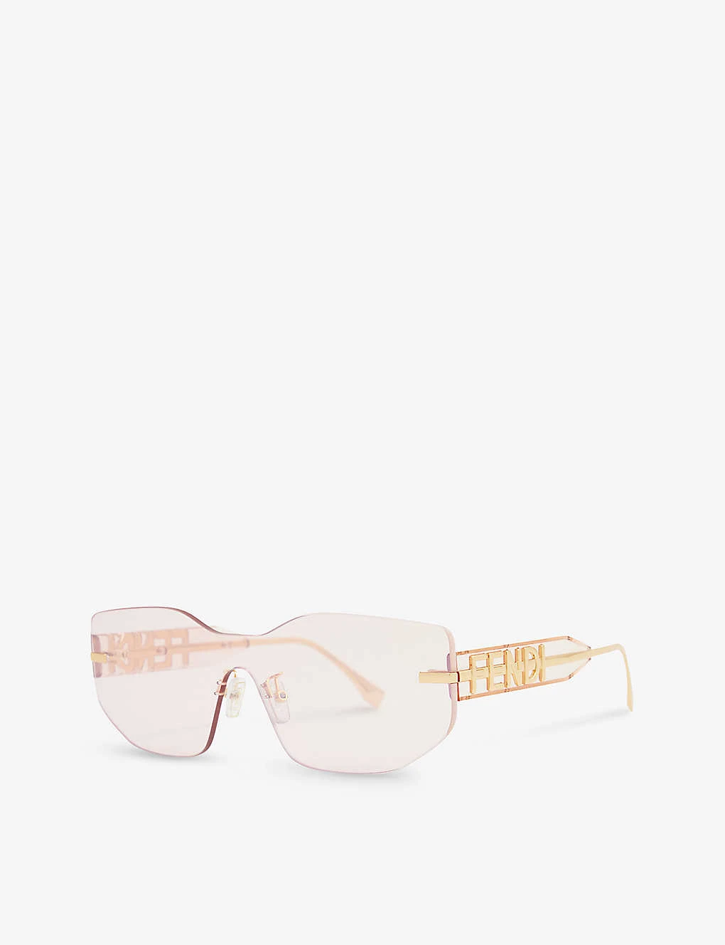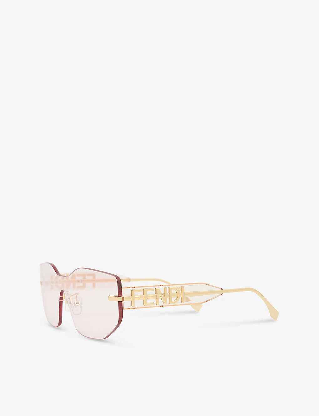 - Pink lenses, nose pads, brand design plaque at temples, gold-toned hardware