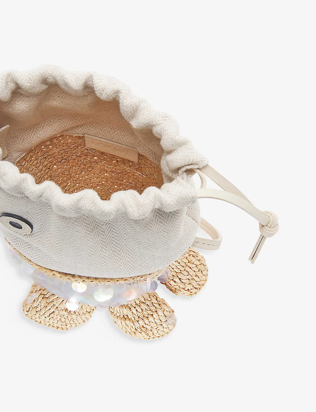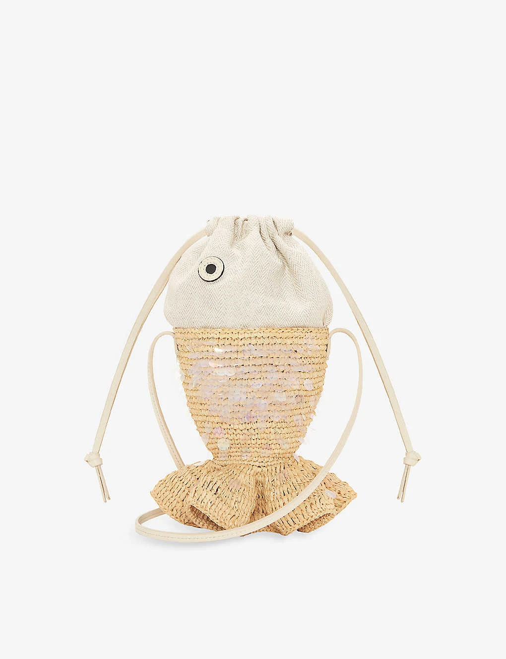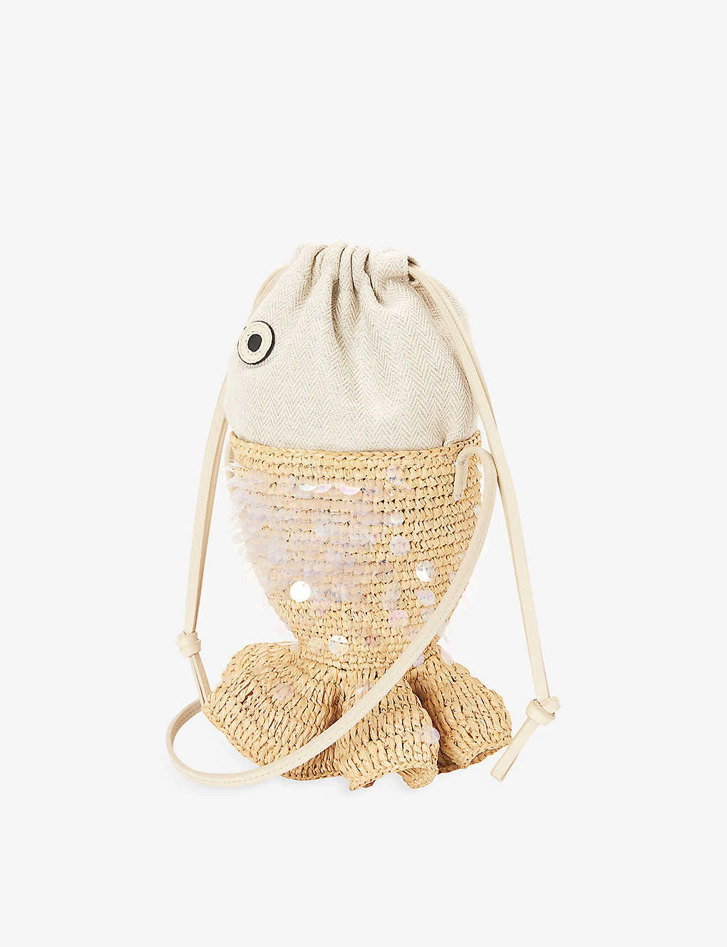- Fish silhouette, sequin-embellished, knotted shoulder strap, ruffle-trimmed, anagram-embossed on interior, unlined