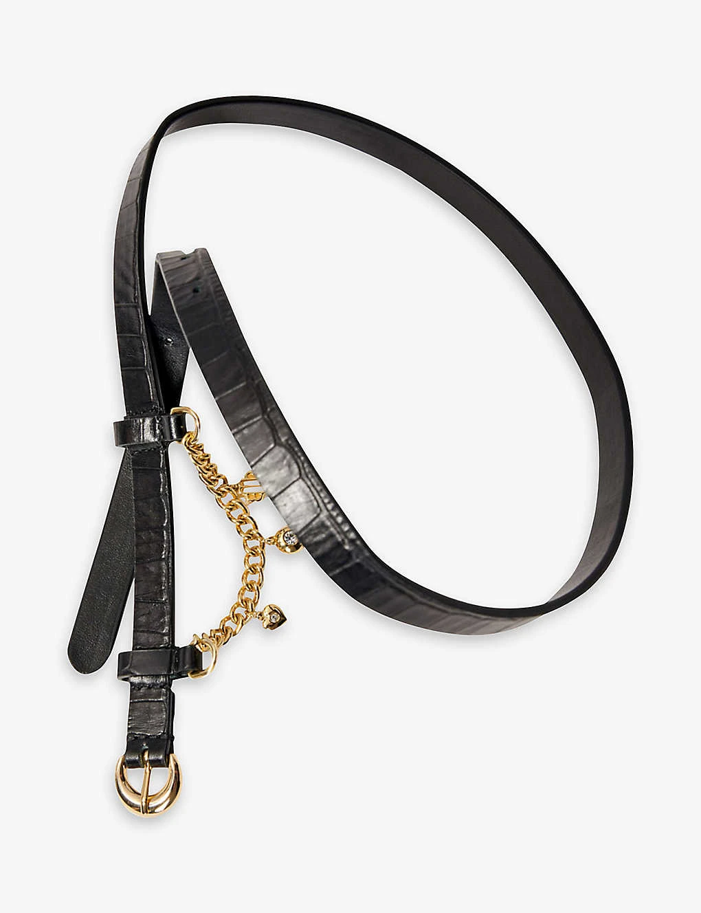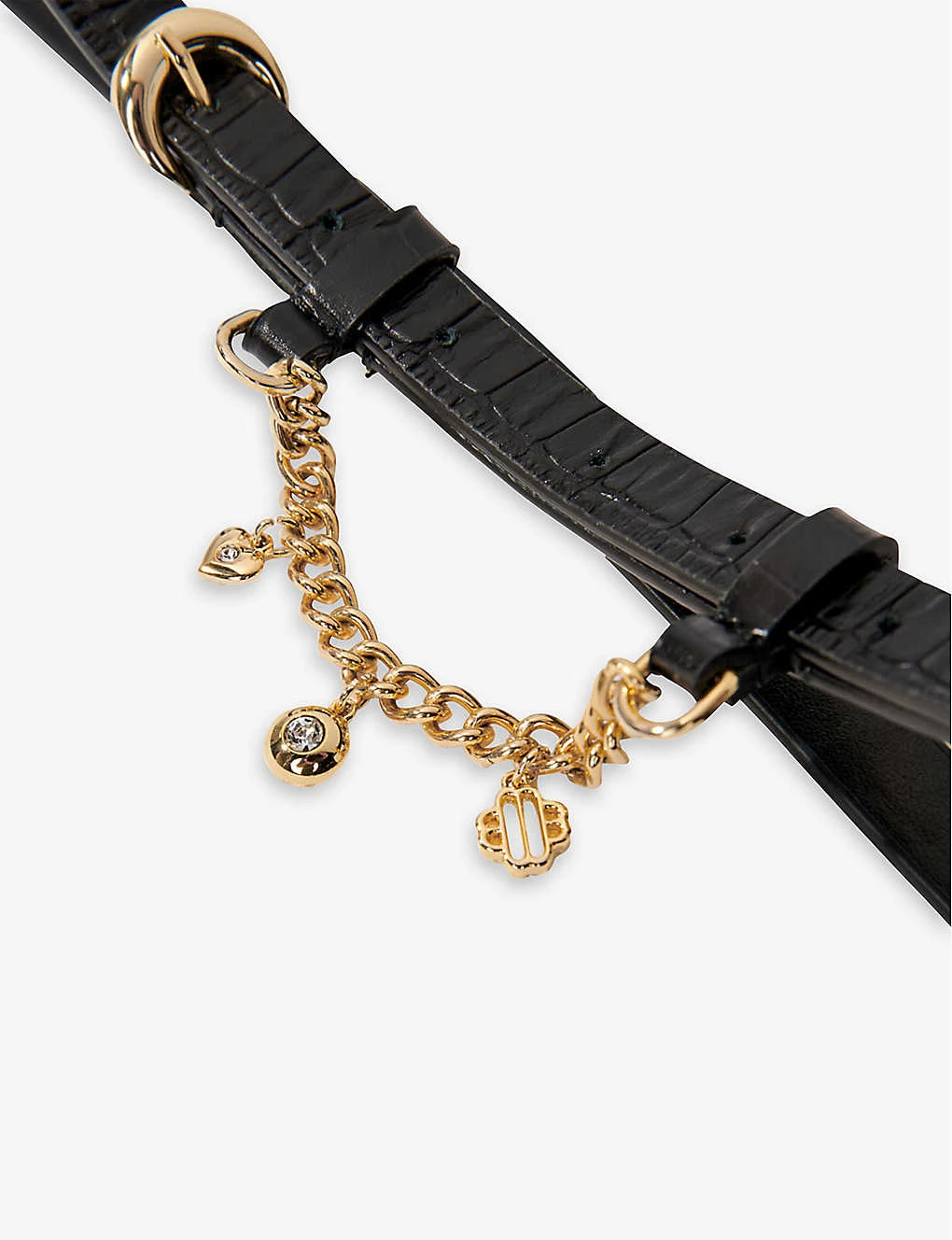 - Narrow silhouette, croc-embossed finish, chain embellishment, gold-tone hardware