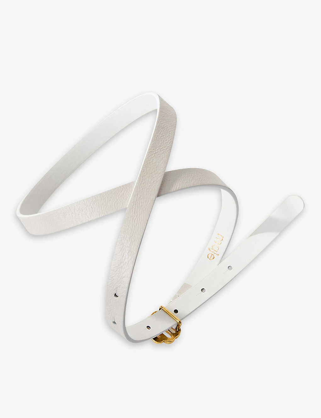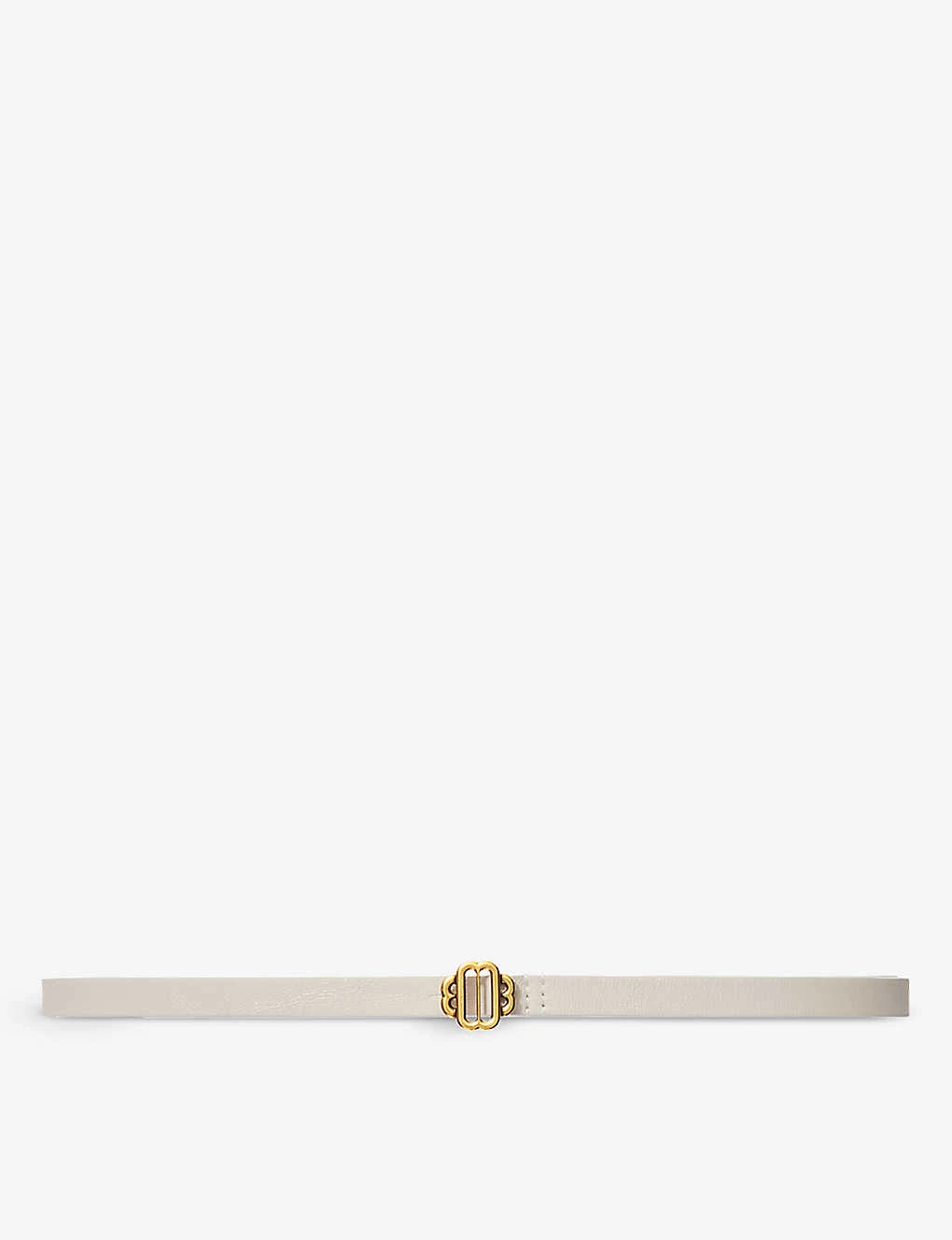 - Branded hardware buckle, thin strap, gold-tone hardware