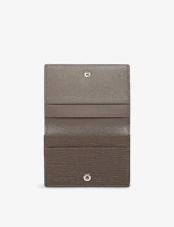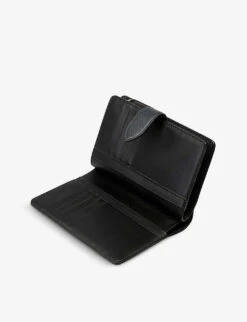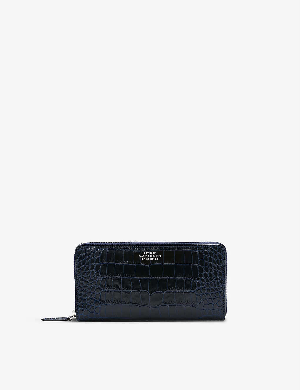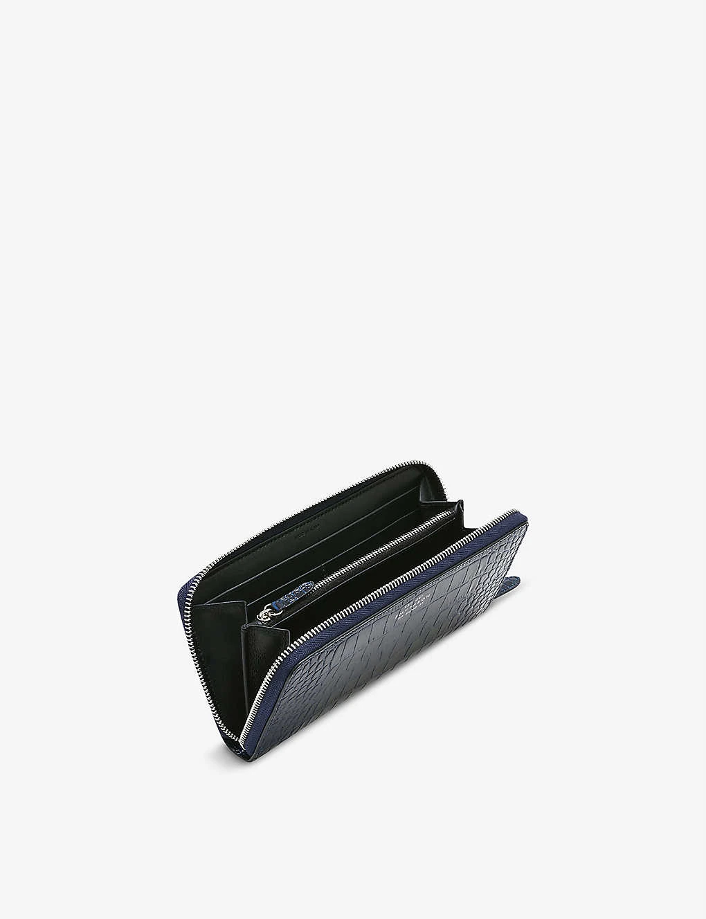 - Foil branding, croc-embossed finish, smooth calf leather interior, eight card pockets, two note pockets, zip coin purse, silver-tone zip