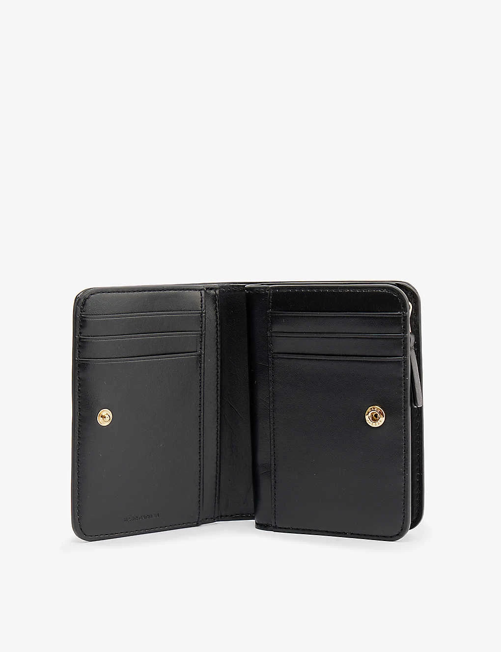- Bi-fold design, branded plaque at front, gold-toned hardware, six card slots at interior, one note slot, four slip pockets at interior, zipped coin purse at interior, fully lined