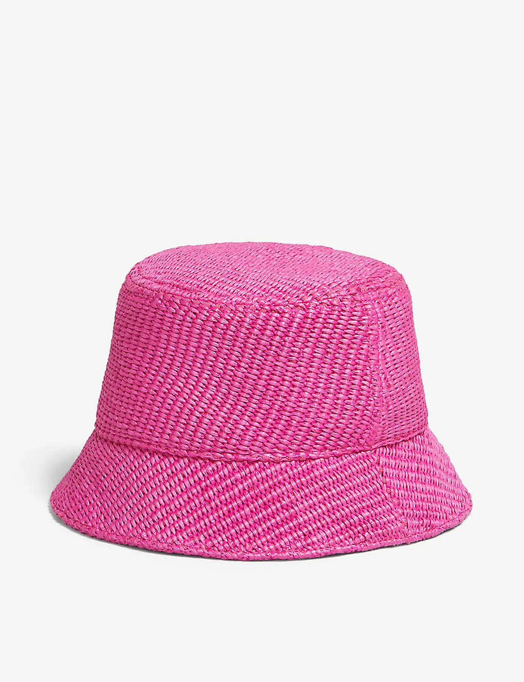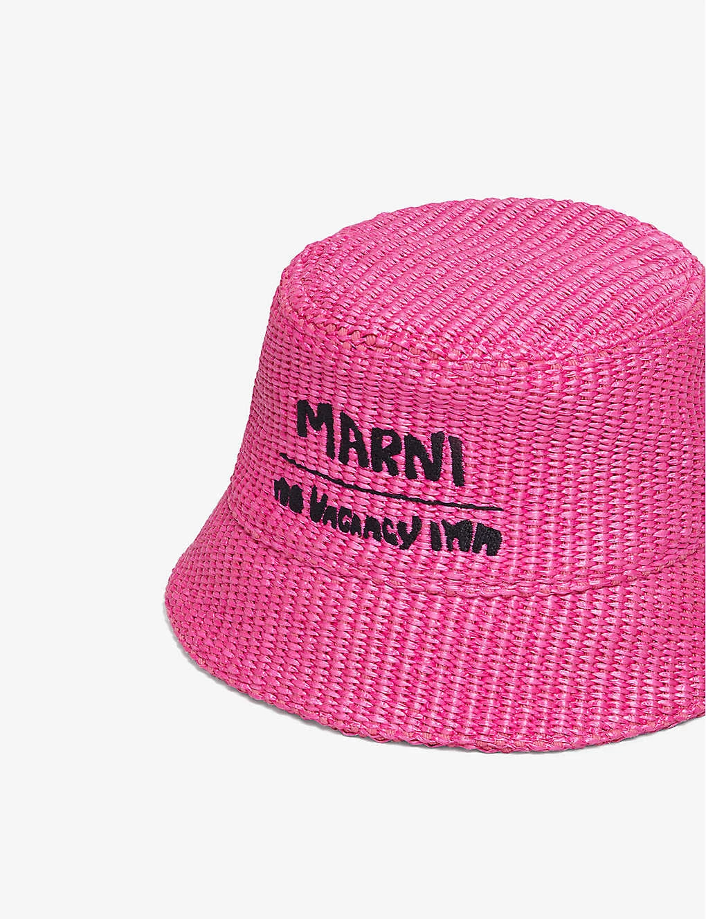 - Bucket shape, wide brim, brand and text embroidery at front, all over raffia pattern, internal sweatband and brand tab