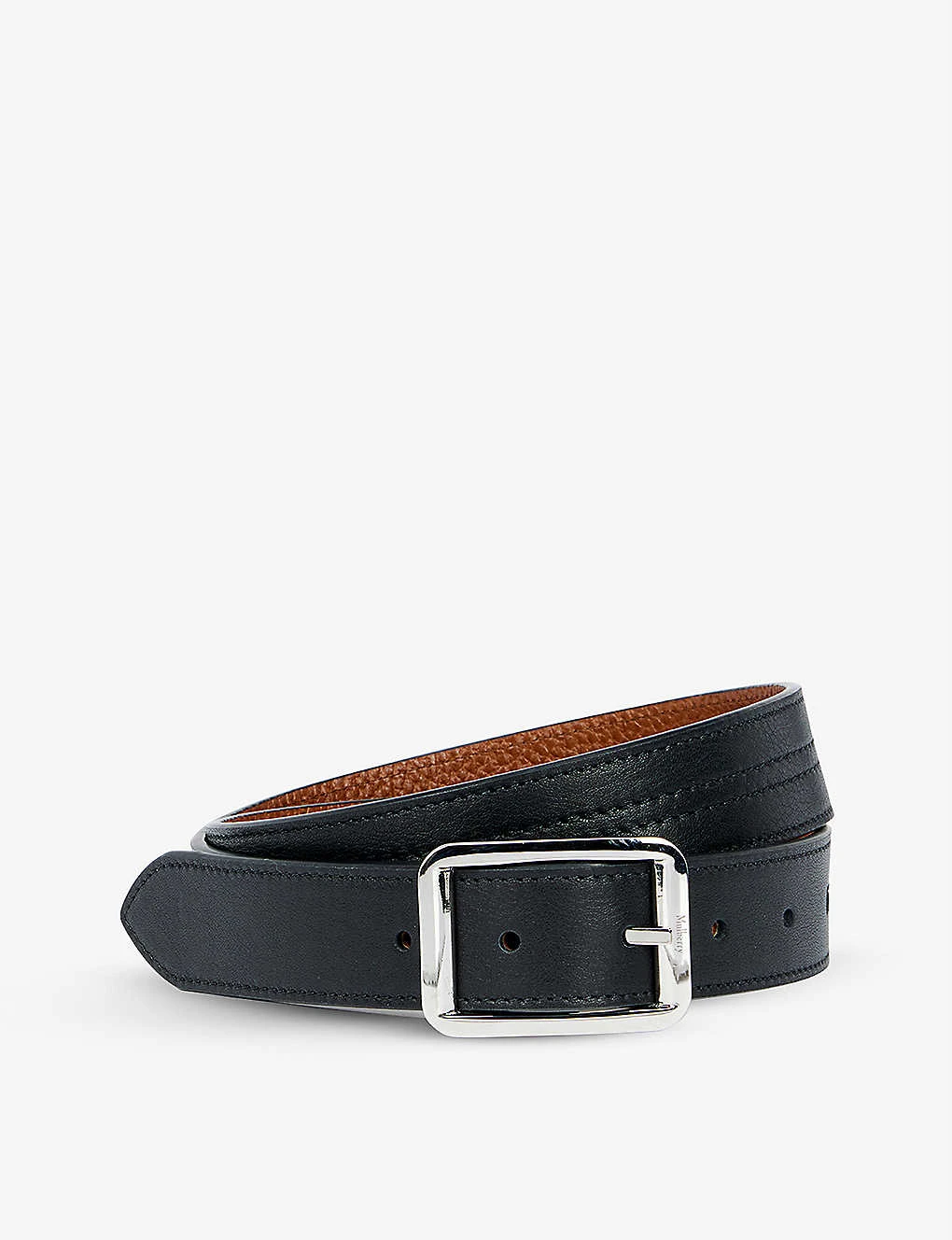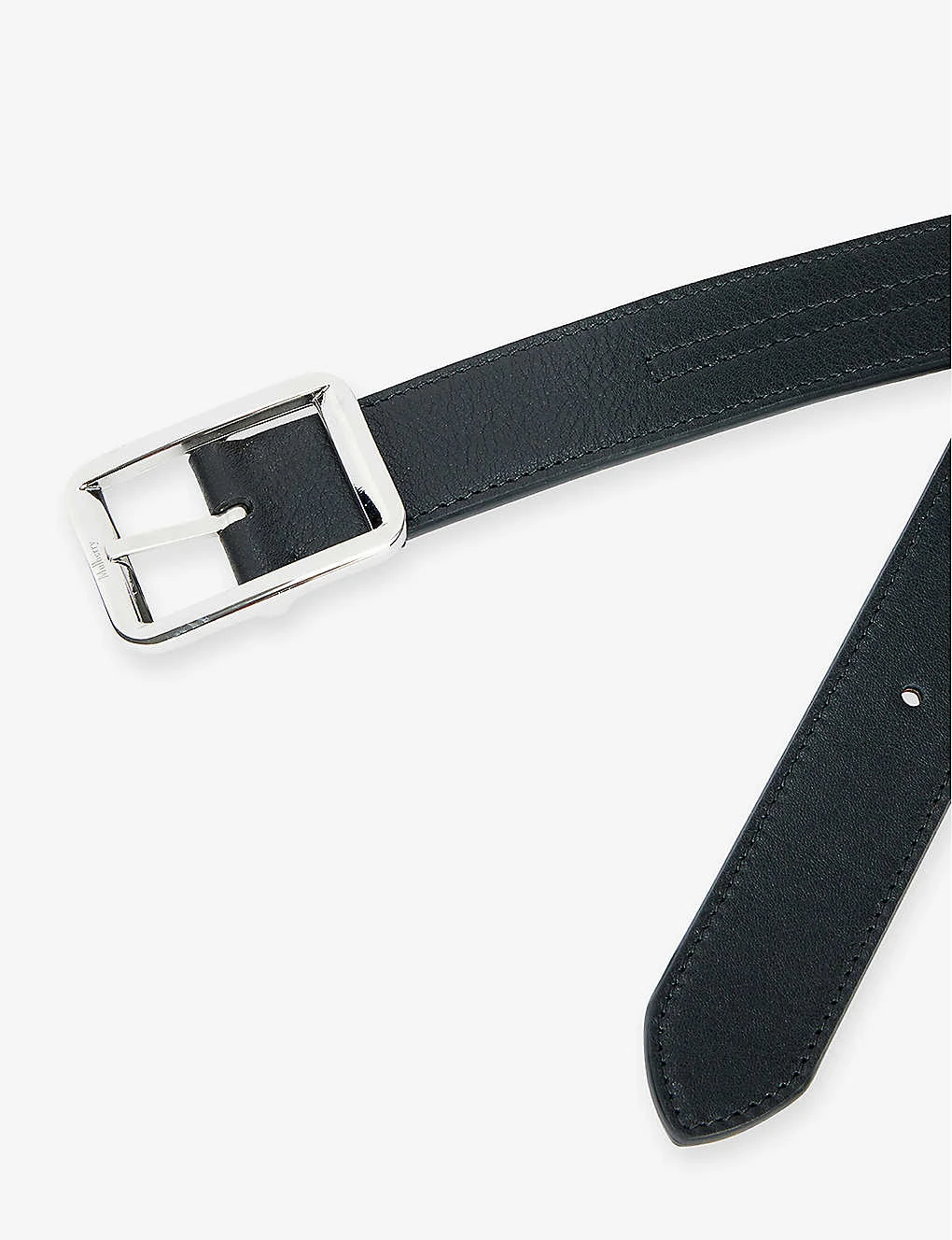 - Silver-toned hardware, engraved brand signature at belt loop, five holes, all over grained leather, reversible