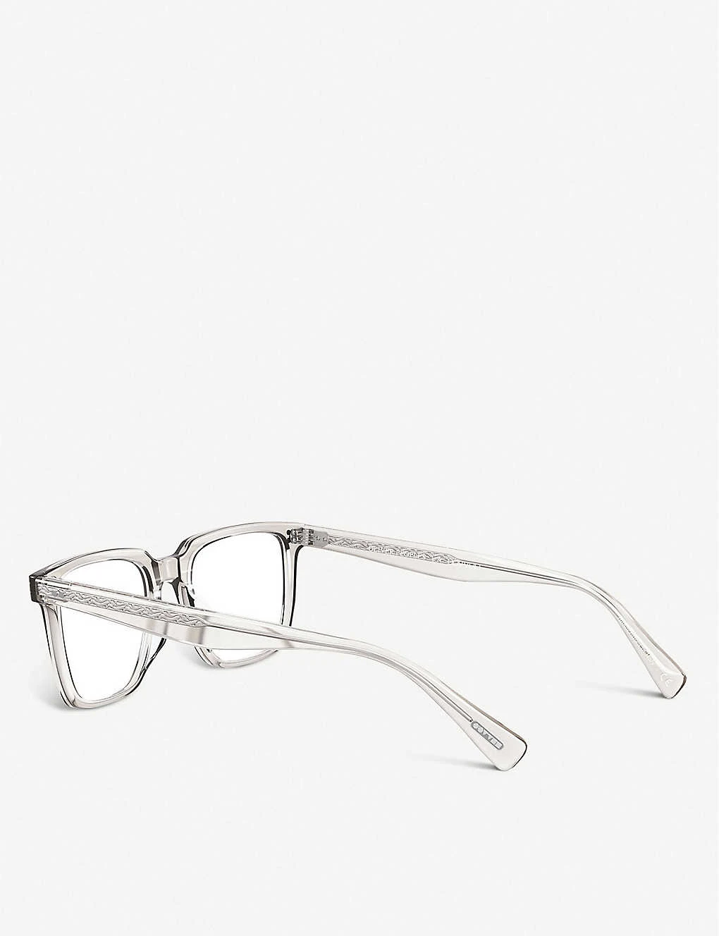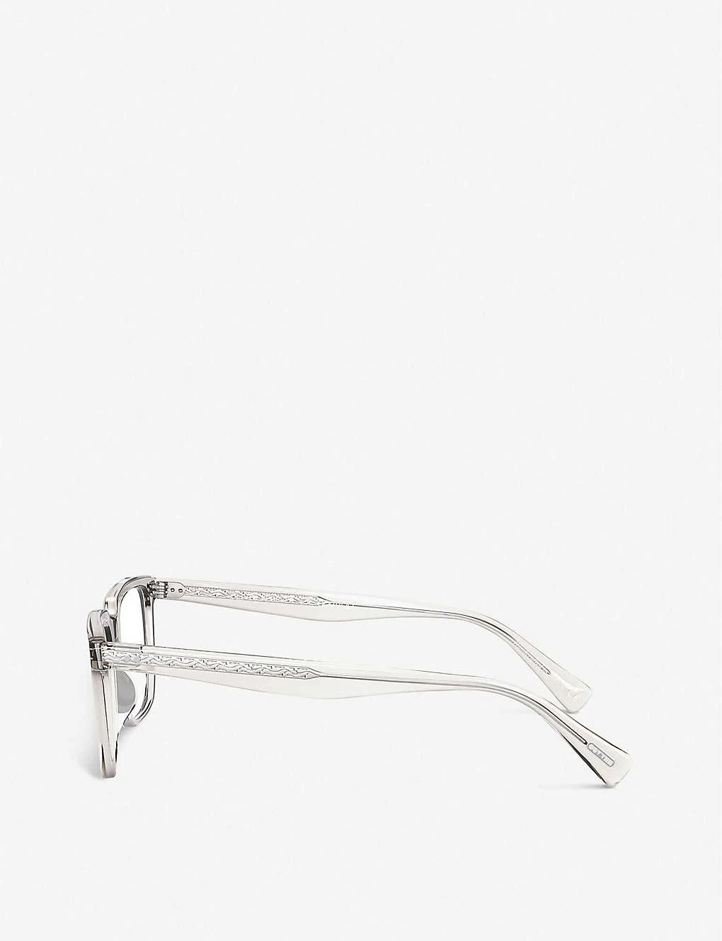 Hand-laid functional pins at front and temple, branding down the arm, engraved detail at arm