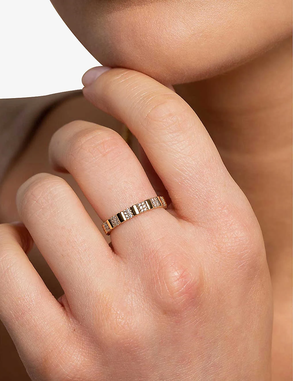 - Ridged band design, pavé setting, polished finish