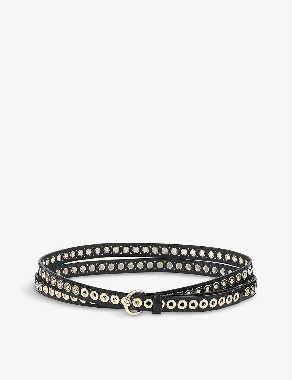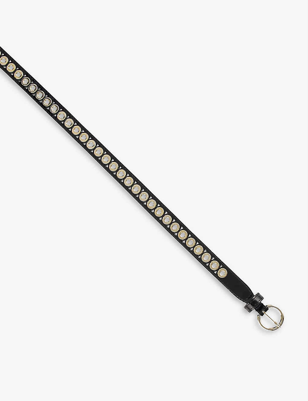 - Smooth leather, gold-tone hardware, eyelet detail, adjustable buckle