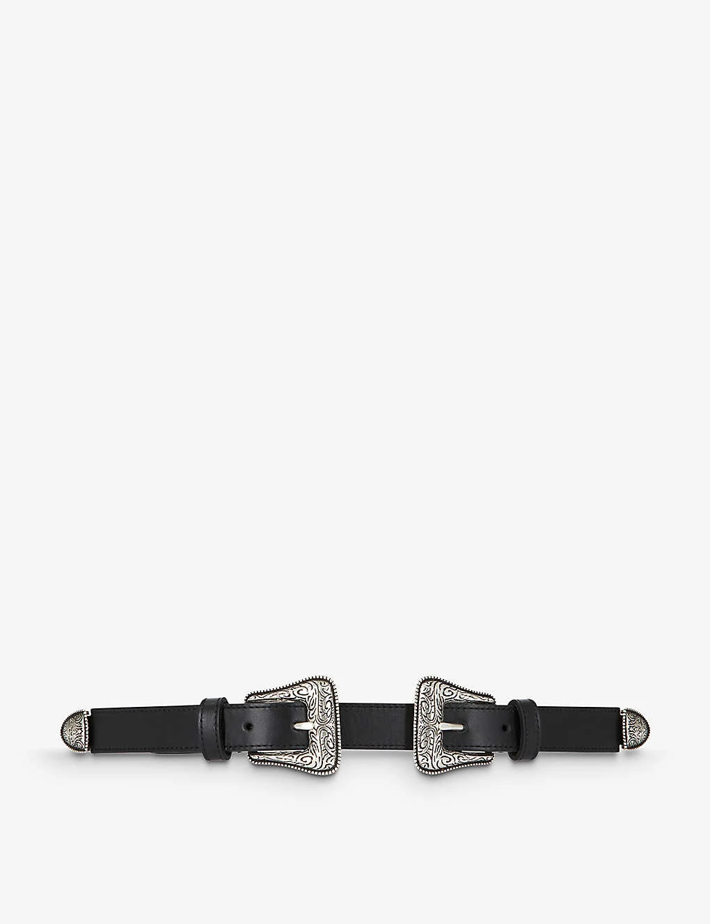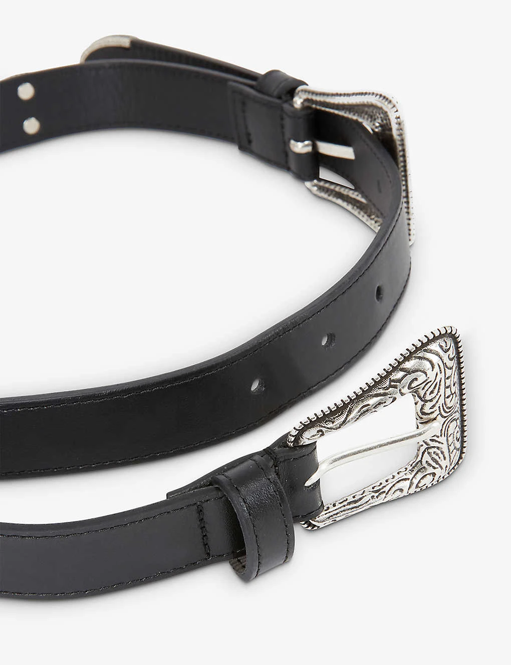 - Engraved western-style buckle, thin belt, adjustable length, silver-tone hardware