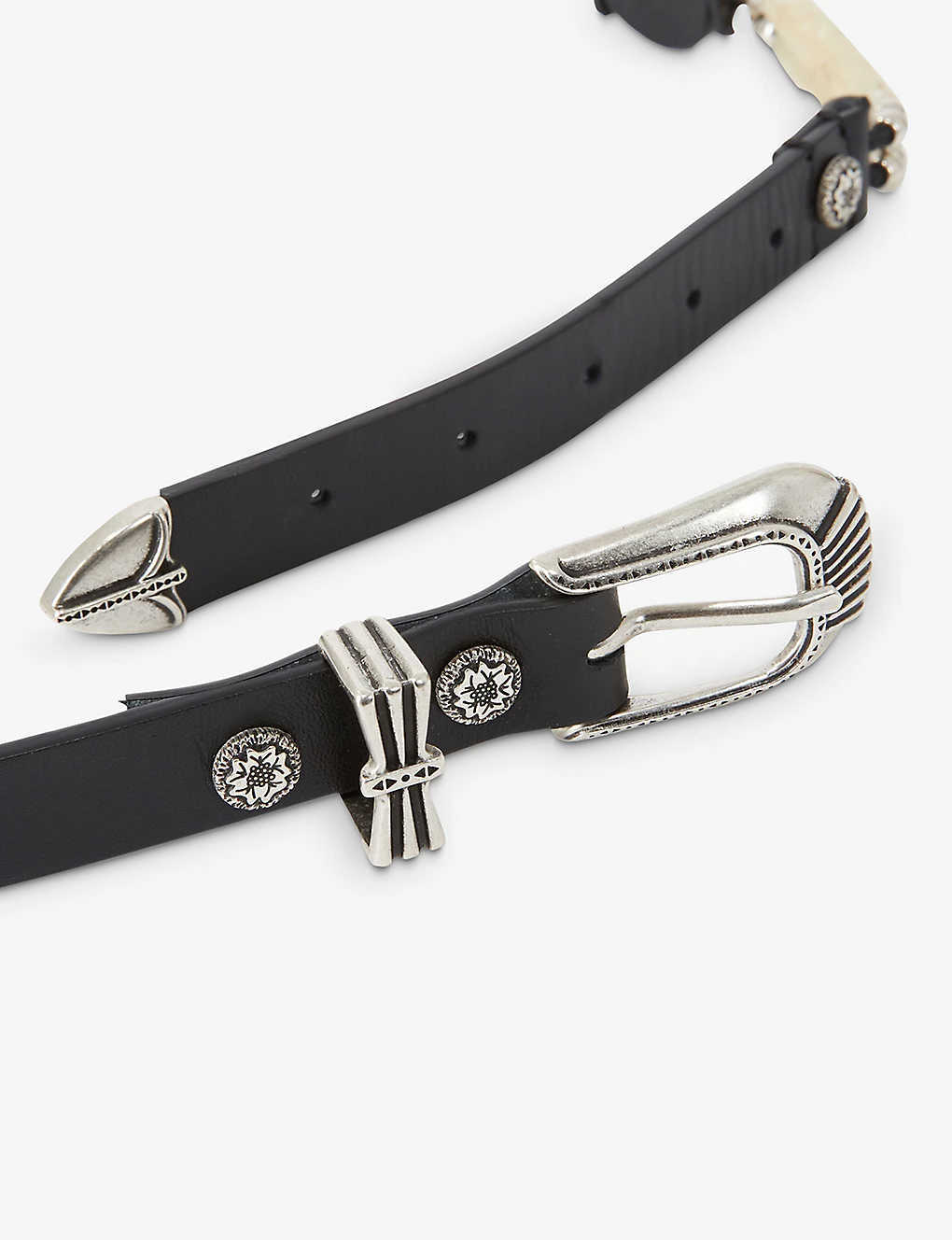 - Engraved buckles, thin belt, perforated holes, faux pearls, beaded embellishments, silver-toned hardware