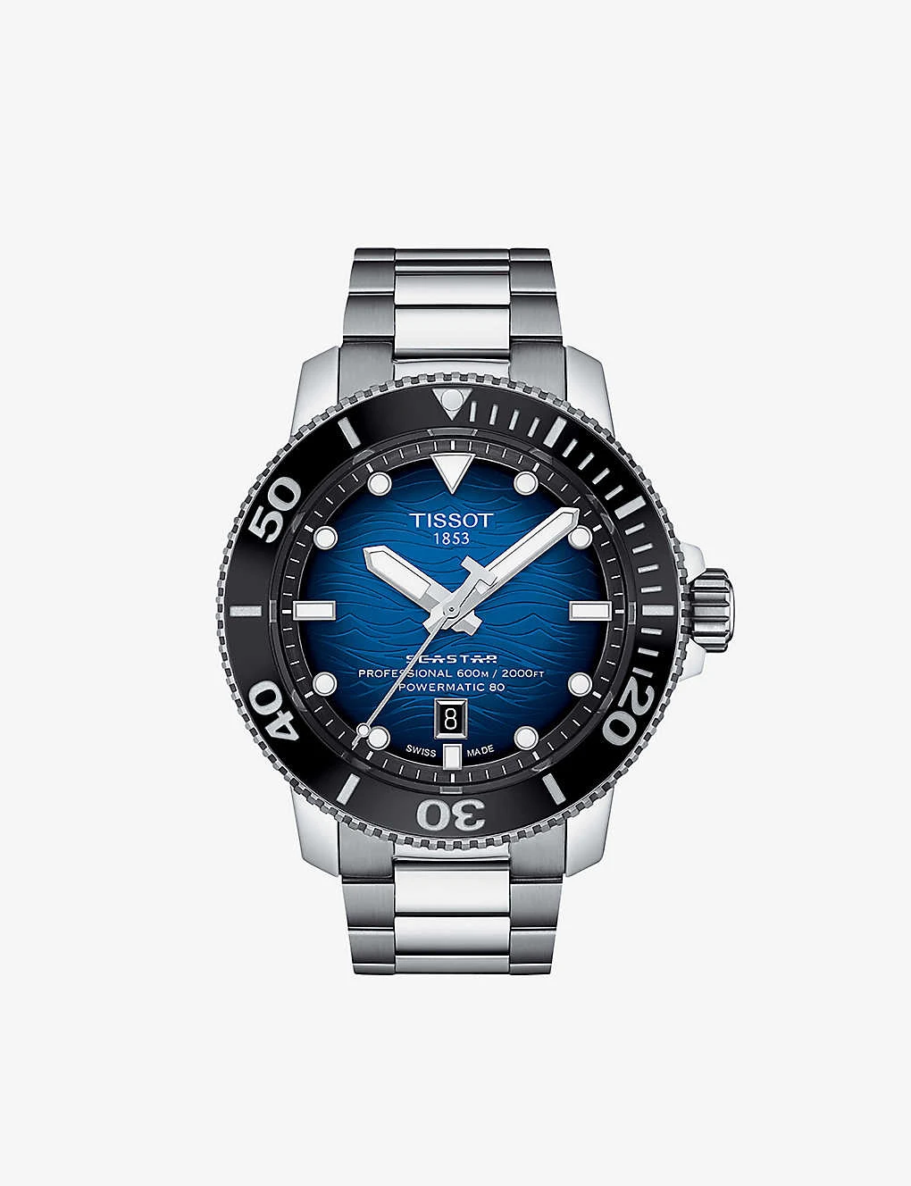 - Round dial, wave-patterned shaded blue dial, helium valve, ISO 6425 certification, automatic calibre with longlasting power reserve, ceramic bezel, domed sapphire glass with a bevelled contour